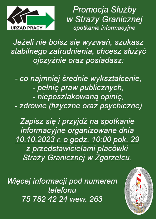 Powiatowy Urząd Pracy w Lwówku Śląskim informuje, iż dnia 10.10.2023 r. o godz. 10:00 pok. 29 odbędzie się spotkanie informacyjne z funkcjonariuszami Placówki Straży Granicznej w Zgorzelcu. Więcej informacji pod numerem telefonu 75 782 42 24 wew. 263