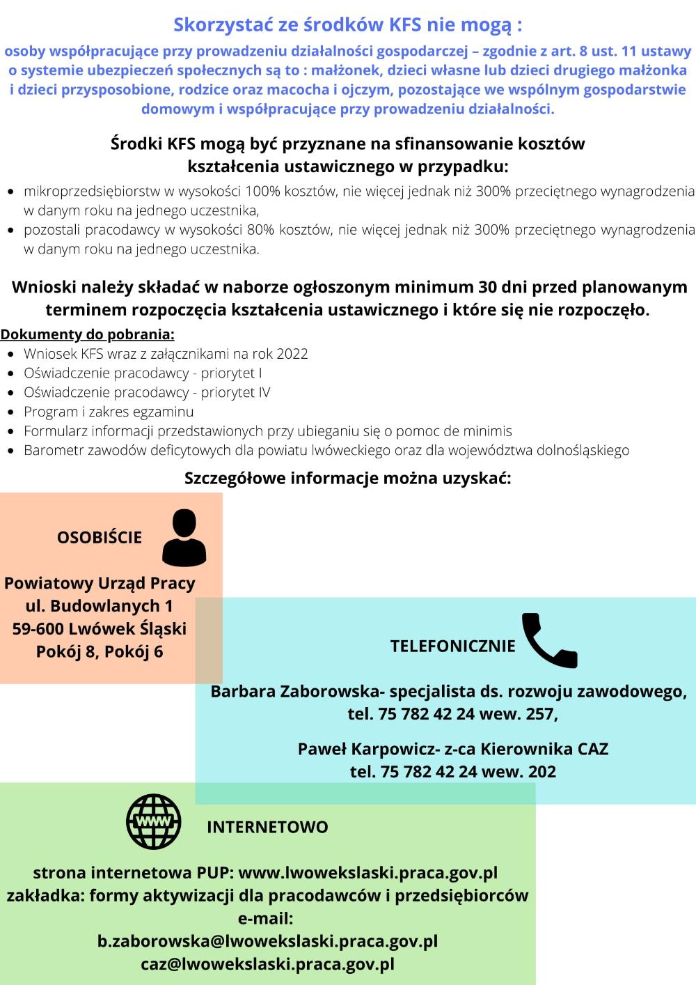 Formularze wniosku dla pracodawcy o dofinansowanie kształcenia ustawicznego ze środków KFS powinny być dostępne na stronie internetowej powiatowego urzędu pracy. Doradca klienta w powiatowym urzędzie pracy udzieli pracodawcy wyjaśnień lub szerszych konsultacji w sprawie złożenia wniosku o dofinansowanie i możliwości otrzymania dofinansowania że środków KFS.